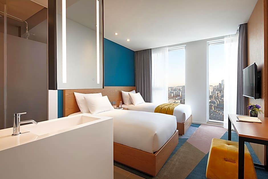 The Superior Room at L7 HONGDAE has twin beds, located on the 11th floor and above. The room offers stunning views of the vibrant streets of Hongdae, Gyeongui Line Forest Park, and the expansive Hongdae cityscape. The room is thoughtfully designed with every detail carefully curated to suit the unique preferences of travelers who visit L7 HONGDAE. Begin your day with comfort and relaxation in the Superior Room on our higher floors. If you don't show your physical card, you may not be able to check in.